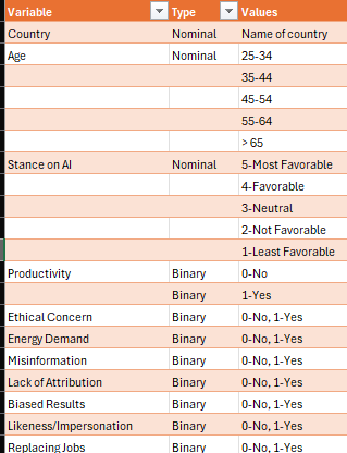 The dataset comprises 41,999 observations (after cleansing for individuals under 18 and those without stances on AI) across developers in 181 countries. After the transformations, it appears as follows.