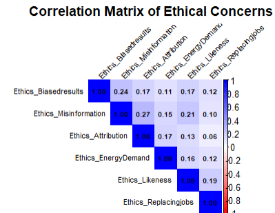 This analysis focused on the outcome (Stance on AI) as correlated to the potential predictor (the six ethical concerns: biased results, misinformation, lack of attribution, energy demand, impersonation or likeness, and the potential for replacing jobs without creating new ones). Energy Demand as a concern appeared to have the highest correlation to less favorable stances. All other ethical issues exhibited a correlation with less favorable stances, except for bias, which showed a slightly positive correlation.