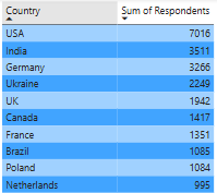 The top ten countries with respondents are as follows, with the US having a significantly high # of people. This may be since the US has a significantly high number of developers in general. It also means views overall may be mainly skewed in favor of US respondents. For this analysis, I have not filtered the dataset by country, although this may be a worthwhile consideration for the next phase.