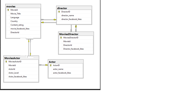 To illustrate with an example – I took the free movie dataset from IMDB and designed it the relational way. So, I have a few tables – movies, actors, directors and such, connected like below.